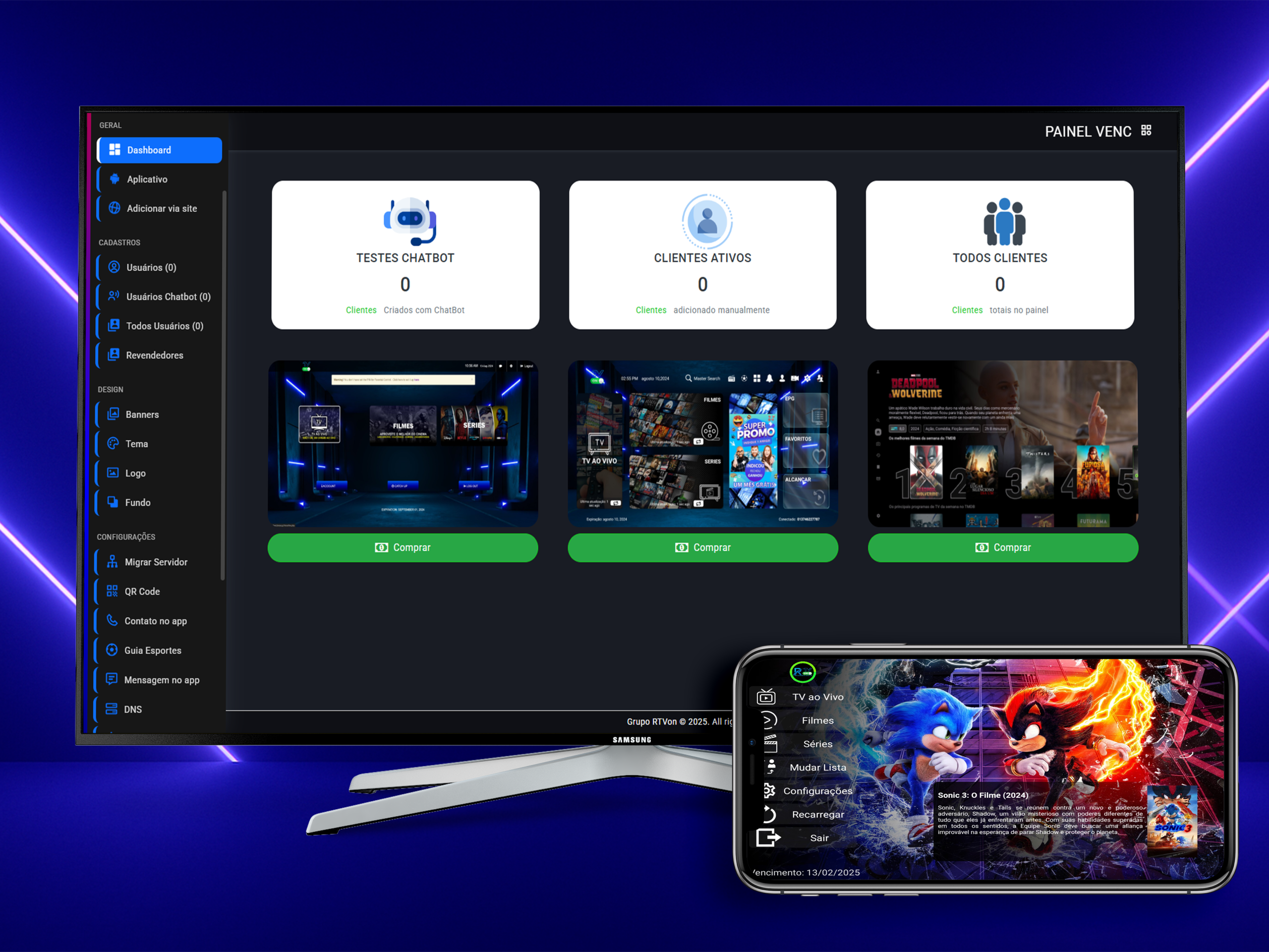 🔸 Sim! O painel de administração é 100% responsivo e funciona perfeitamente em celular, tablet, computador, TV Box, Fire Stick, entre outros.