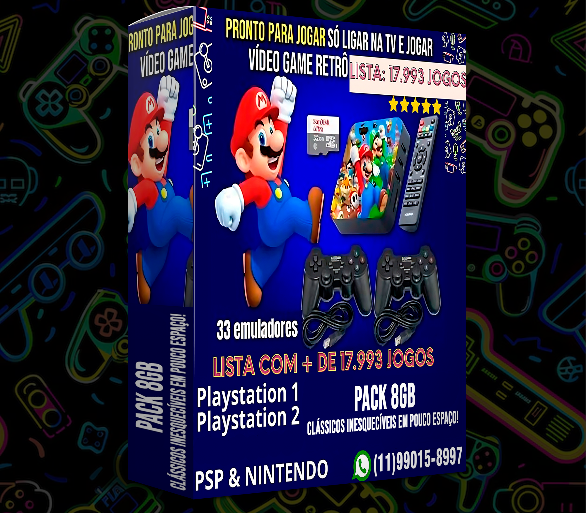 🎮 Inclui centenas de títulos de consoles clássicos como Atari, NES, SNES, Master System, Mega Drive e Game Boy.
