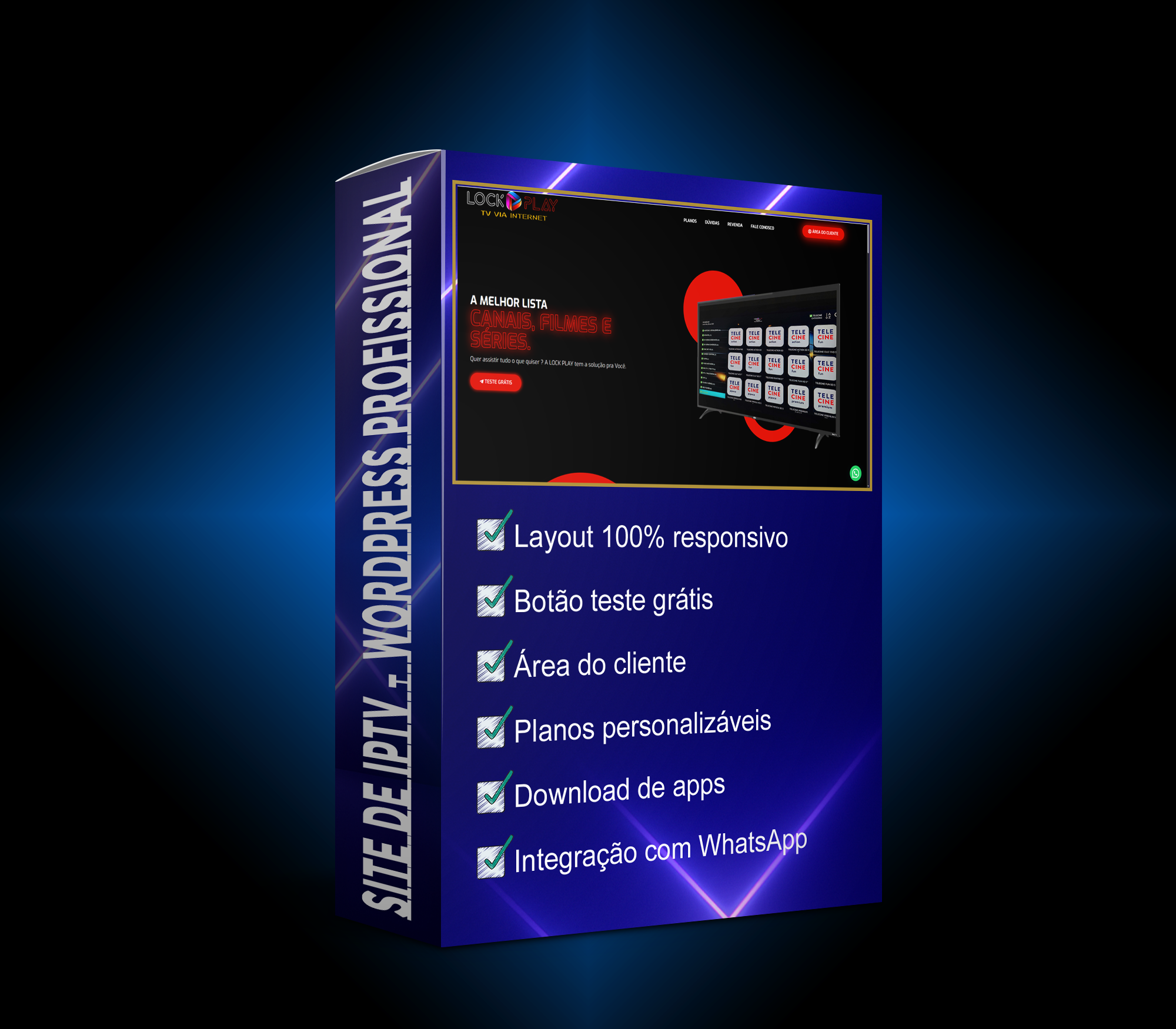 Tenha um site moderno, responsivo e 100% gerenciável em WordPress, ideal para vender planos de IPTV com estrutura profissional e pronta para converter.